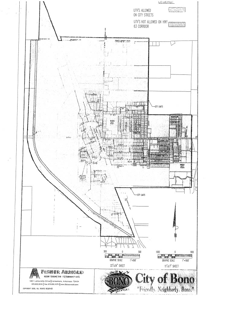 - Pursuant to Arkansas Code Annotated Section 27-21-111((a)(2)(B), the City of Bono sets forth the designated streets and highways in the city limits, showing where operation is permitted and not permitted in the map attached hereto as Exhibit A.